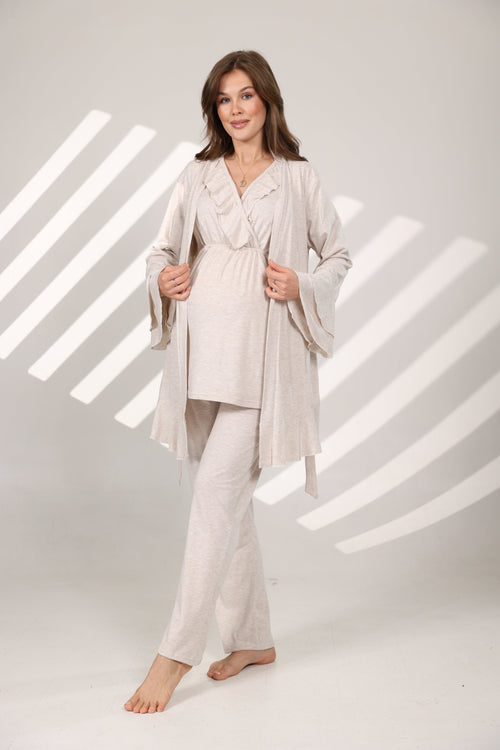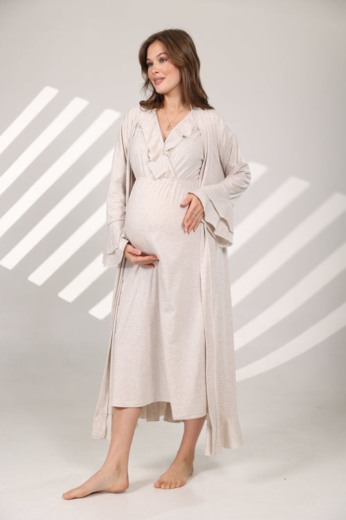 Ekru Biyeli Sabahlıklı Kruvaze Lohusa Gecelik Takımı