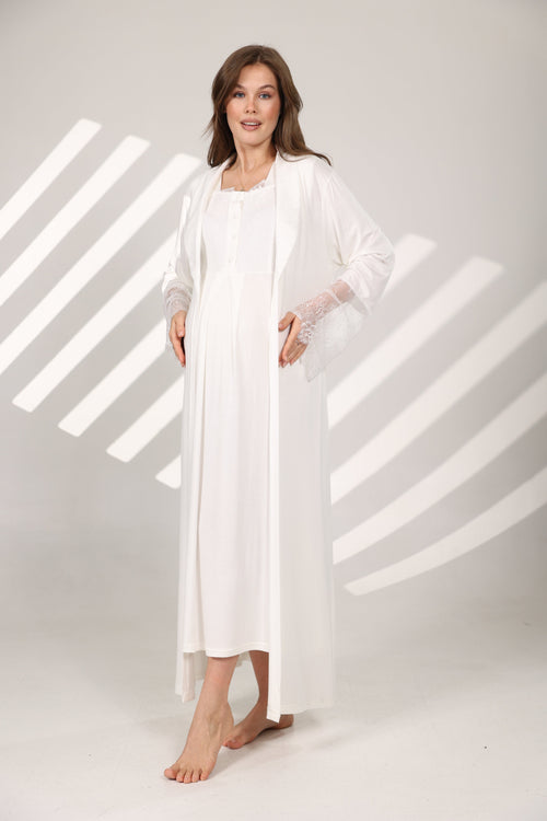 Kışlık Bej Krepon Dokulu Sabahlıklı Lohusa Pijama Takımı-1005 -